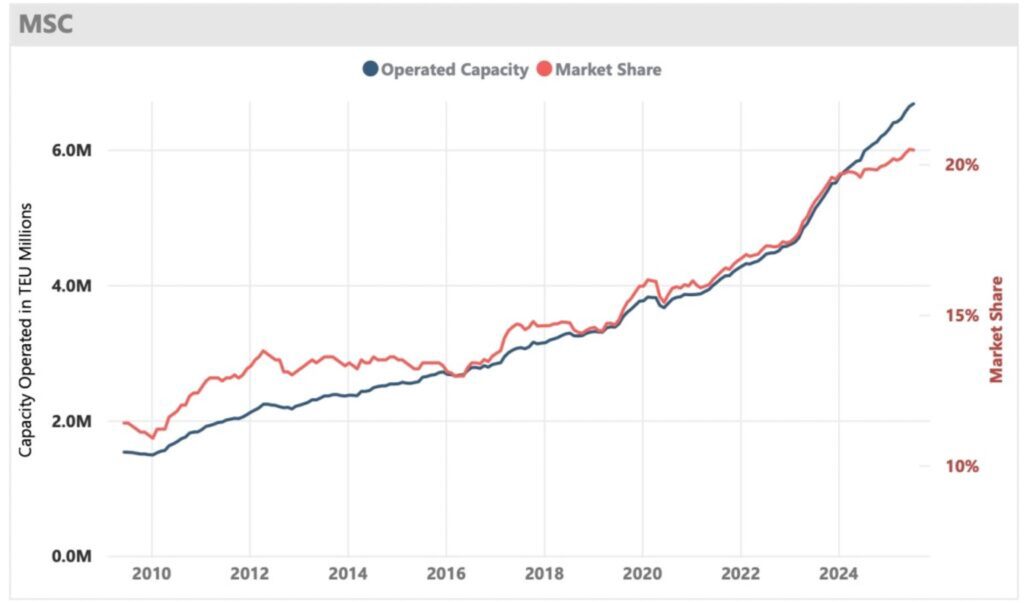 Geneva-headquartered MSC will become the first carrier to cross through the 7m teu mark in the coming months. It has nearly tripled in size over the past decade via a massive newbuild campaign and a historic foray in the secondhand markets.