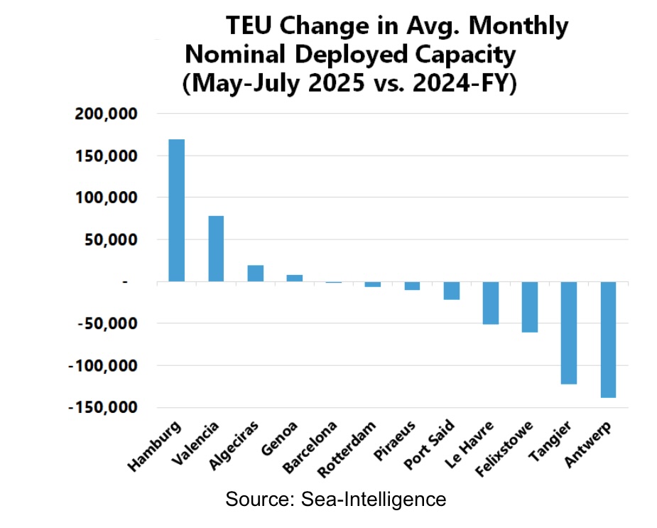 Analysis by Danish container shipping consultancy Sea-Intelligence of the 2025 alliance reshuffle on Asia-Europe, reveals a consolidation of market power into hubs like Hamburg and Valencia, at the expense of established gateways such as Antwerp and Tangier.
